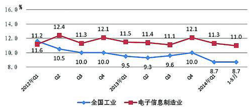 2014年1-5月,規(guī)模以上電子信息制造業(yè)增加值同比增長(zhǎng)11.0%,高出工業(yè)平均水平2.3個(gè)百分點(diǎn),但比去年同期和去年年底分別下降0.3和1.1個(gè)百分點(diǎn)。實(shí)現(xiàn)銷售產(chǎn)值、出口交貨值、內(nèi)銷產(chǎn)值同比分別增長(zhǎng)9.0%、3.2%和15.7%,比1-4月分別下降0.6、0.7和0.5個(gè)百分點(diǎn)。