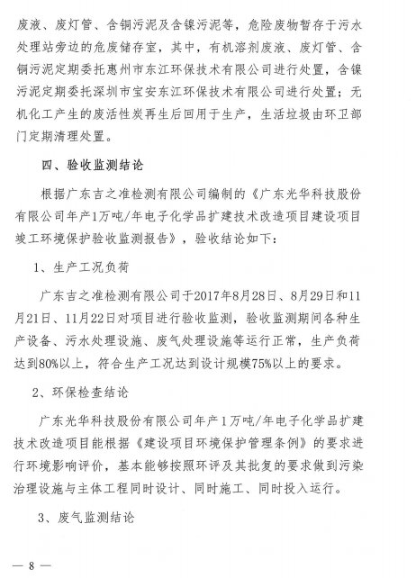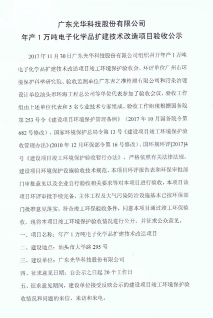 光華科技年產(chǎn)1萬(wàn)噸電子化學(xué)品擴(kuò)建技術(shù)改造項(xiàng)目于2017年11月30日組織了項(xiàng)目竣工環(huán)保自主驗(yàn)收,經(jīng)過(guò)專家組及參會(huì)人員的共同評(píng)審,同意本項(xiàng)目通過(guò)竣工環(huán)保驗(yàn)收,現(xiàn)予以公開(kāi)。