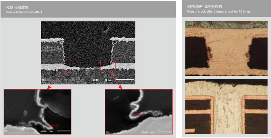 TS-EcuSet series refers to the low-temperature electroless copper applied to horizontal line, and has alkaline ionized palladium activation system to realize uniform, compact and stable electroless copper on the hole formed by resin and glass fiber.